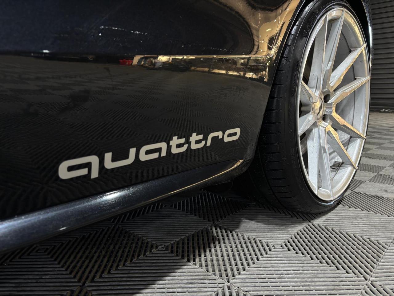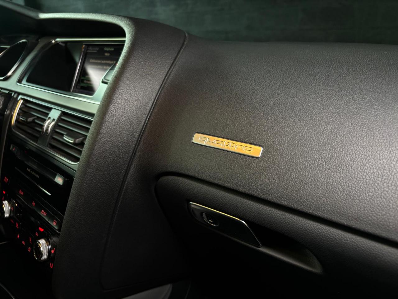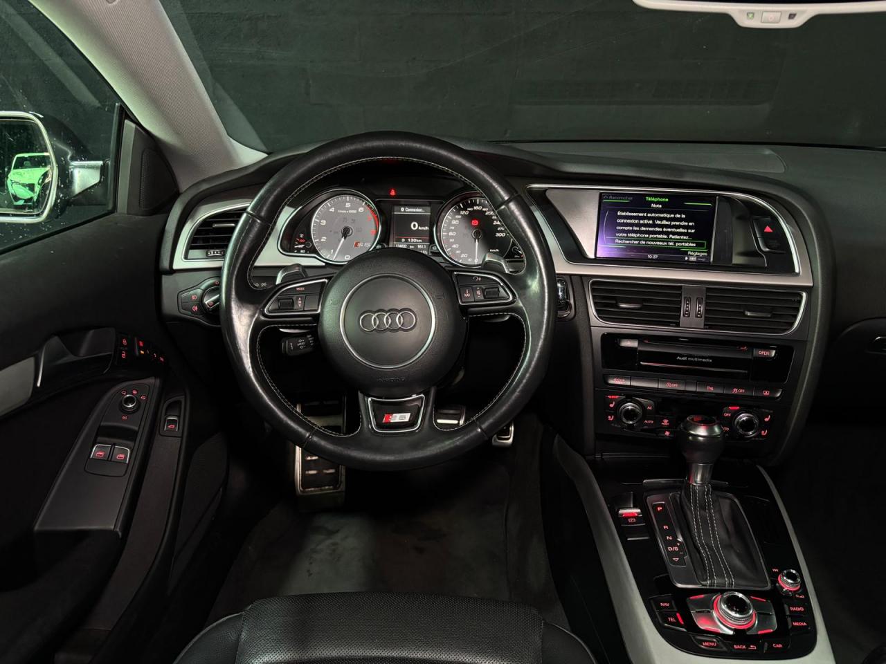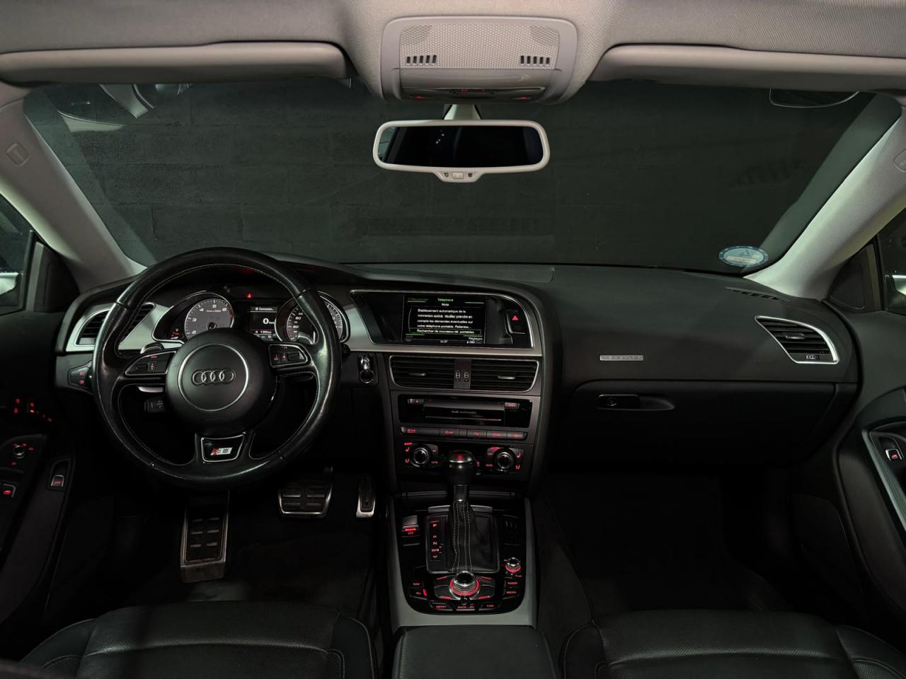 4 œilletons de fixation dans le coffre, pour maintenir les bagages et objets ; points d'accrochage pour le filet mixteAccoudoir central avant avec vide-pochesAdvanced Key : système d'autorisation d'accès et de démarrage main libreAirbags grand volume pour conducteur et passager avant avec détection de position d'assiseAirbags latérauxAllume-cigare intégré dans le cendrier avantAntipatinage électronique ASRApplications décoratives en aluminium brossé mat sur les contre-portes, les garnitures latérales à l'arrière ainsi que sur la console centraleAppuie-tête avant et arrière règlables en hauteurAudi Hold AssistAudi Tracking SystemAvertisseur deux tons avec commande au centre du volantBecquet arrière intégré au couvercle de coffreBlocage électronique de différentiel EDSCapot de coffre à ouverture automatique lors du déverrouillage du coffre par la télécommande, par la touche située sur la portière ou par actionnement de la touche douce sur le capot de coffre. Fermeture manuelleCarrosserie galvaniséeCeintures de sécurité automatiques à trois points pour les quatre places, avec contrôle du port de ceinture à l'avant, couleur assortie à celle de l'habitacleCendriers dans la console centrale à l'avant et à l'arrièreChâssis sport S avec suspension et amortisseurs plus fermes pour un contact plus direct avec la chaussée et une conduite sportive ; incluant jambes de force en dôme, essieu avant allégé à 5 bras avec essieu radial virtuel, barre stabilisatrice tubulaire ; essiCiel de pavillon en tissu, selon la couleur choisie, argent lunaire ou noirClimatisation automatique Confort Plus 3 zones à fonctionnalités étendues et affichage numériqueColonne de direction de sécurité : contient un système mécanique de déplacement avec fonction d'amortissement qui complète le potentiel de sécurité de la ceinture et de l'airbagContact d'allumage électronique ; clé de contact pouvant mémoriser différentes données d'entretienContrôle de pression des pneus : vérifie durant la marche la pression de chacune des rouesCric dans le coffreDésactivation de l'airbag du passager avantDétecteur de pluie et allumage automatique des projecteursDossier des sièges arrière rabattable séparément 2/3 - 1/3, avec déverrouillage à distance des dossiers depuis le coffreEclairage intérieur à extinction temporisée et contacteurs sur toutes les portières ; éclairage coffre, conducteur passager avant et arrière, deux spots de lecture à l'avant, éclairage intérieur de l'arrière, miroir de cEcrous antivolEntourages de vitre en aluminium, revêtement noir brillant sur les montants de pavillon centraux et les vitres de custode arrièreEtui à lunettes dans le module d'éclairage intérieur, à l'avant, au-dessus du rétroviseurFonction Start/Stop : coupure et redémarrage automatiques du moteur en cas d'arrêt prolongé, désactivable par un bouton sur la console centraleFrein de stationnement électromécanique : comprend la fonction de frein de stationnement à l'arrêt, assistance de démarrage avec désactivation automatique lors du démarrage et fonction de freinage d'urgence sur les quatre rouesGPS PlusIndicateur d'usure des garnitures de frein à l'avant, affichage dans le système d'information de conducteurIndicateur de rapport de vitesse dans le système d'information du conducteur : apporte assistance au conducteur dans le choix du rapport de vitesse adaptéIndicateur de température extérieure dans le système d'information du conducteur, en cas de températures inférieures à +5 °C, un cristal de glace apparaît sur l'afficheur, avertissant de la possibilité de verglasInstrumentation à éclairage réglable, tachymètre électronique avec compteur kilométrique totalisateur et journalier, compte-tours, horloge, indicateur de température du liquide de refroidissement et jauge de carburantJantes en aluminium coulé style S 5 branches doubles, 8,5 J x 18”, avec pneus 245/40 R18Lave-glace, deux vitesses, réglage d'intermittence sur 4 niveaux, commande de balayage coup par coup, lavage-balayage automatiqueLève-vitres avant électriques avec protection antipincement et fonction confort d'ouverture/fermeture par impulsion ; vitres arrière fixesLimiteurs d'effort des ceintures de sécurité avantLunette arrière dégivrante avec minuterieOrdinateur de bord couleur et système de contrôle autocheck (incluant programme efficiency)Outillage de bord dans le coffrePack EclairagePhares antibrouillard intégrés dans le pare-chocsPoignées de maintien amorties, rabattables à 2 positions, encastrées dans le ciel de pavillonPoignées de portes couleur carrosseriePré-équipement attelagePréparation ISOFIX pour sièges latéraux arrière et siège passager avantPréparation téléphone 2 W bi-bande (D et E), sans support pour adaptateur ni antenne de toit, commande sur volant multifonction, mains libres, interface BluetoothPrétensionneurs des ceintures de sécurité avantProgramme électronique de stabilisation ESC : relie ABS, EBV, ASR et EDS avec ses propres capteurs et compare les données de conduite avec les données de référence ; assure davantage de stabilité par freinage ciblé des roues et intervention dans la geProtection antidémarrage électronique, intégrée à la gestion du moteur, activation automatique par la clé du véhiculeQuattro: transmission intégrale permanente avec répartition asymétrique et dynamique de coupleRangements dans les contre-portes à l'avant avec casier de rangement pour boissons, rangements à l'arrière sur les côtés du siège et dans les garnitures latérales arrièreRéglage d'appuis lombaires électriques sur 4 plans pour sièges avantRégulateur de vitesse électronique actif dès 30 km/hRétroviseur intérieur jour/nuit automatique incluant une bande grise en haut du pare-briseRétroviseurs extérieurs avec clignotant latéral intégré à diodes, réglable électriquement, boîtiers dans la couleur
